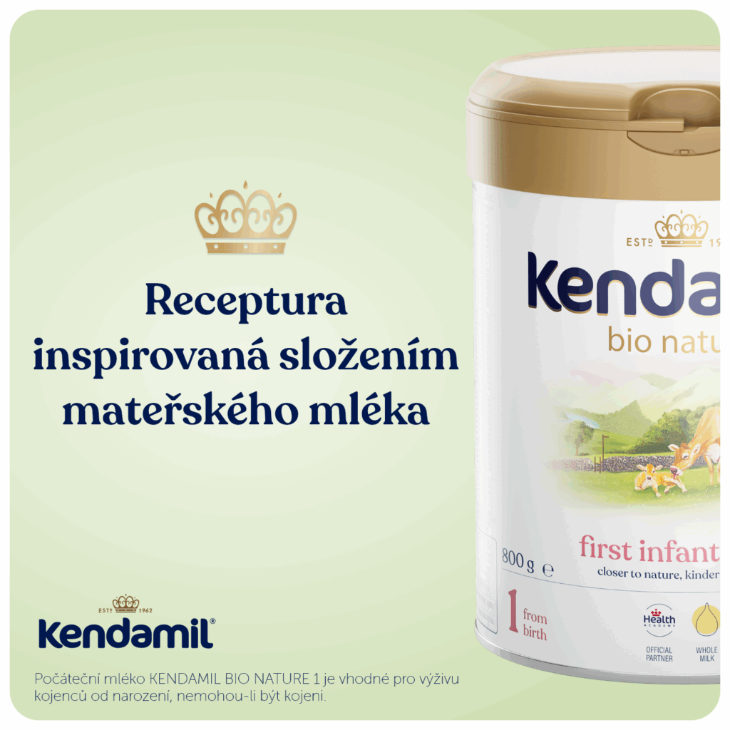 Více než 60 let výzkumu a vývoje v každé kapce. Kojenecká mléčná výživa Kendamil BIO Nature, inspirovaná přírodou a složením mateřského mléka, je vyrobena z kvalitního plnotučného kravského mléka v BIO kvalitě s přirozeným obsahem mléčného tuku. Určeno pro kojence od narození do ukončeného 6. měsíce, pokud nemohou být kojeni. Certifikováno pro vegetariány.