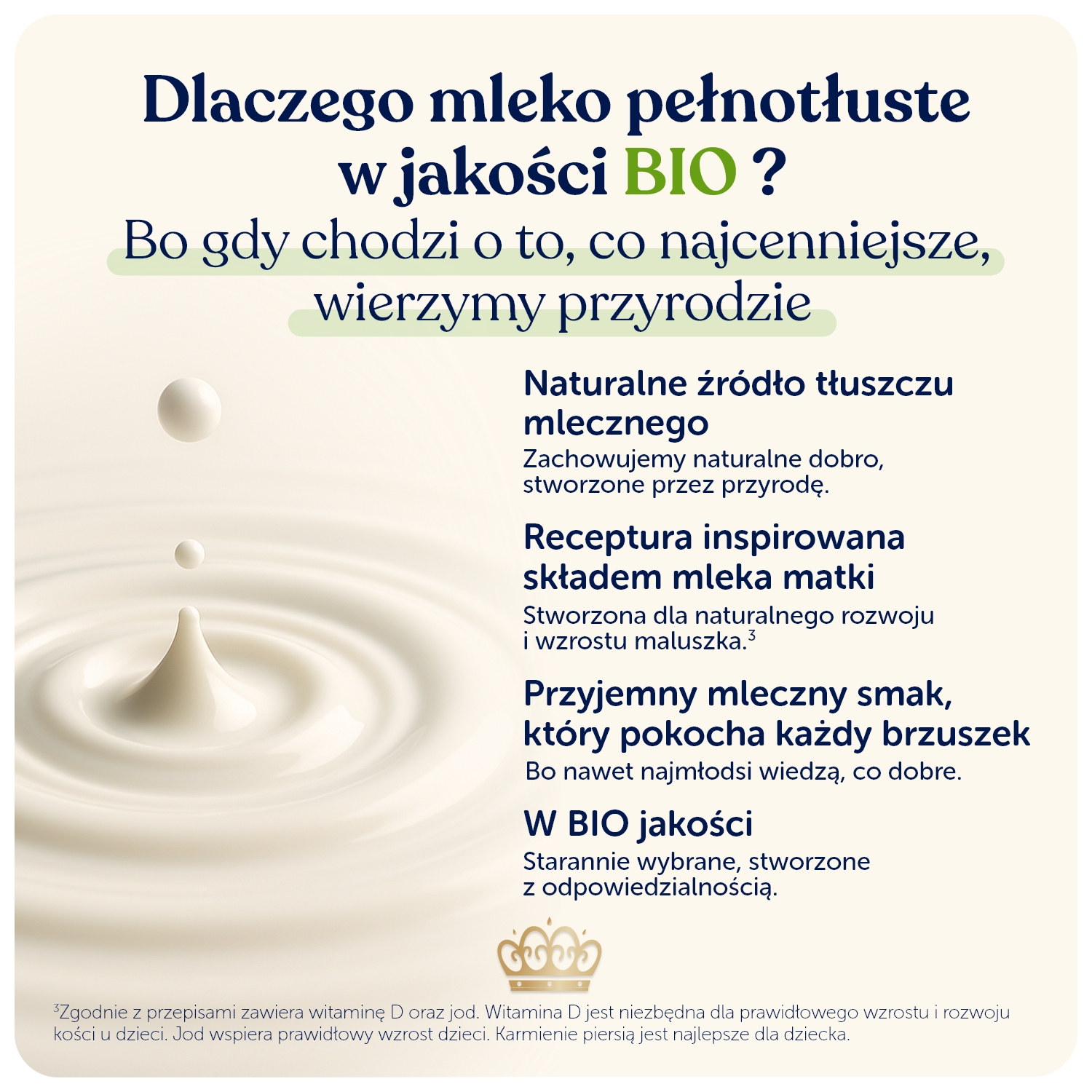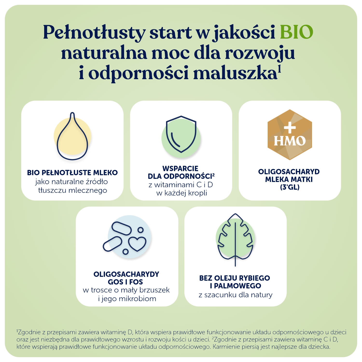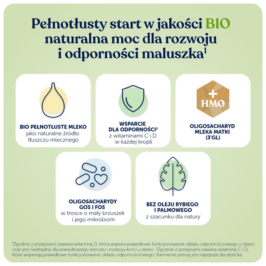 BIO pełnotłuste MLEKO (147 g płynnego MLEKA na 100 g proszku), BIO białko serwatkowe (z MLEKA), BIO laktoza (z MLEKA), BIO oleje roślinne (słonecznikowy, kokosowy, rzepakowy), BIO galaktooligosacharydy (z MLEKA), BIO śmietana (z MLEKA), cytrynian sodu, emulgator: BIO lecytyna słonecznikowa, chlorek potasu, sole potasowe kwasu ortofosforowego, olej z mikroalg Schizochytrium sp., diwinian choliny, sole wapniowe kwasu ortofosforowego, sole wapniowe kwasu cytrynowego, olej z Mortierella alpinawęglan wapnia, Nukleotydy (5′-monofosforan cytydyny, sól disodowa urydyny-5-’monofosforanu, 5′-monofosforan adenozyny, sól disodowa 5′-monofosforanu inozyny, sól disodowa 5′-monofosforanu