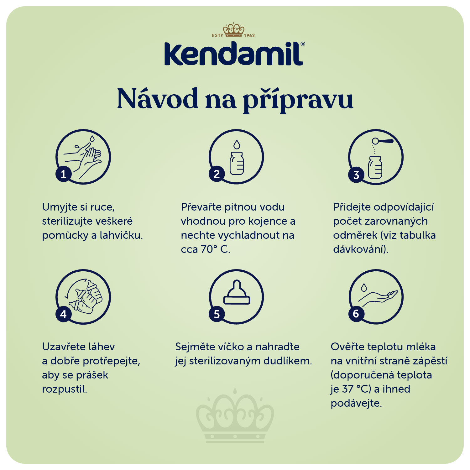 Důležité instrukce pro krmení: Používejte správné množství zarovnaných odměrek, jak je instruováno. Dítěti může být špatně při použití více nebo méně odměrek, než je nařízeno. Pokud připravené mléko nevyužijete do 2 hodin od připravení, doporučujeme jej vylít a připravit nové. Nepřidávejte do připraveného mléka produkty, které jsou určené pro dospělé, jako např. trvanlivé kravské mléko. Neohřívejte v mikrovlnné troubě.