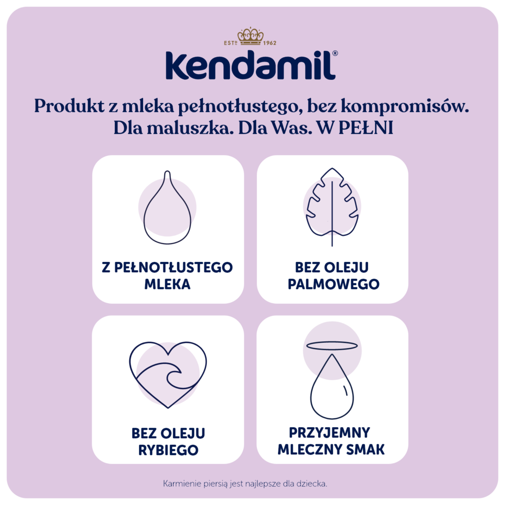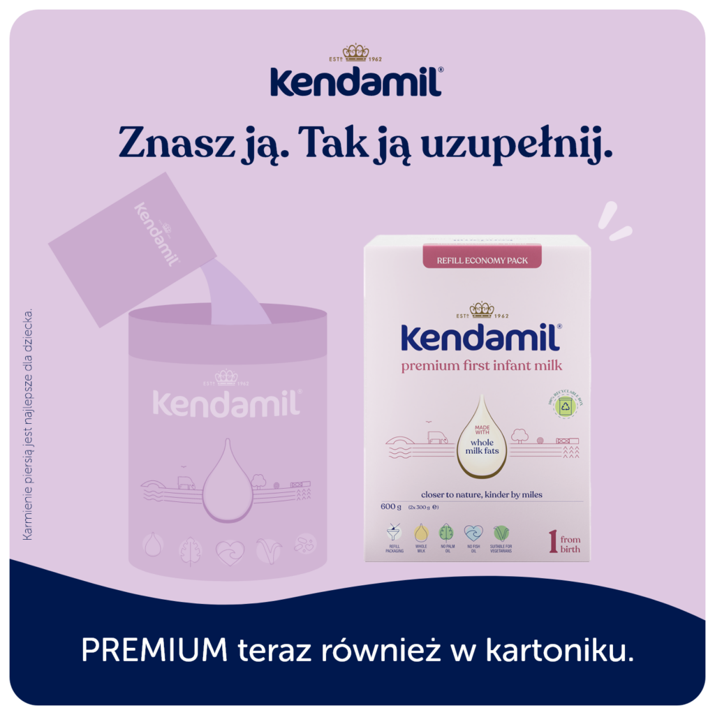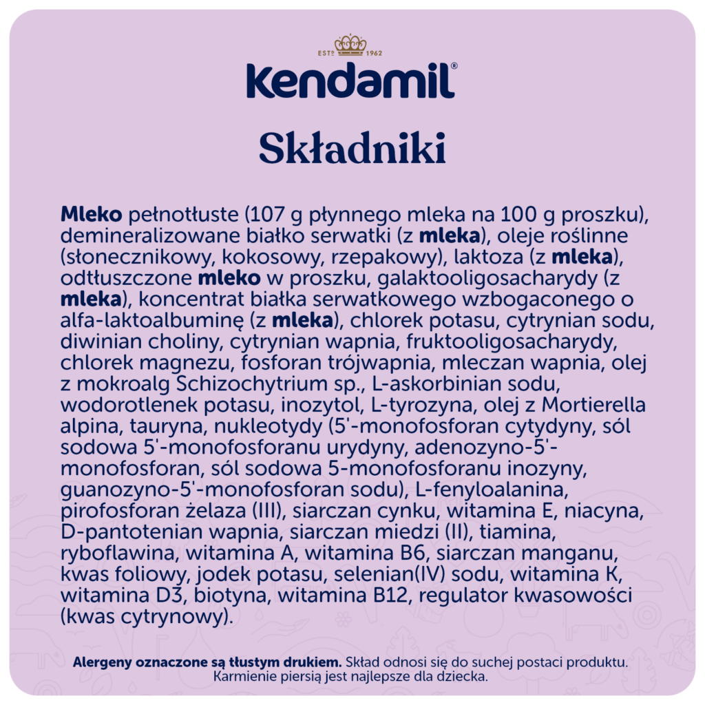 Ważna uwaga: Karmienie piersią jest najlepszym sposobem żywienia niemowląt. Preparat dla niemowląt KENDAMIL PREMIUM 1 jest odpowiedni do karmienia niemowląt już od urodzenia, jeśli nie mogą być one karmione piersią i powinien być stosowany wyłącznie za radą niezależnych osób wykwalifikowanych w dziedzinie medycyny, żywienia, farmacji lub innych specjalistów odpowiedzialnych za opiekę nad matką i dzieckiem. Dbaj o higienę jamy ustnej dziecka w okresie wzrostu jego pierwszych ząbków, zwłaszcza przed snem. Postępuj zgodnie z instrukcjami dotyczącymi przygotowania, karmienia i przechowywania, w przeciwnym razie zagrozisz zdrowiu niemowlęcia.
