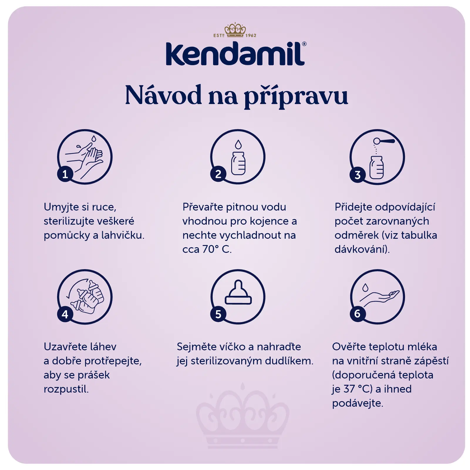 Důležité upozornění: Kojení je nejlepší způsob výživy kojenců. Počáteční mléko KENDAMIL PREMIUM 1 je vhodné pro výživu kojenců od narození, nemohou-li být kojeni, a mělo by být užíváno pouze na radu nezávislých osob kvalifikovaných v lékařství, výživě nebo farmacii, nebo jiných odborníků odpovědných za péči o matku a dítě. Pečujte o hygienu ústní dutiny v období růstu prvních zoubků, především před spaním. Dodržujte pokyny pro přípravu, krmení a skladování, jinak ohrozíte zdraví kojence.