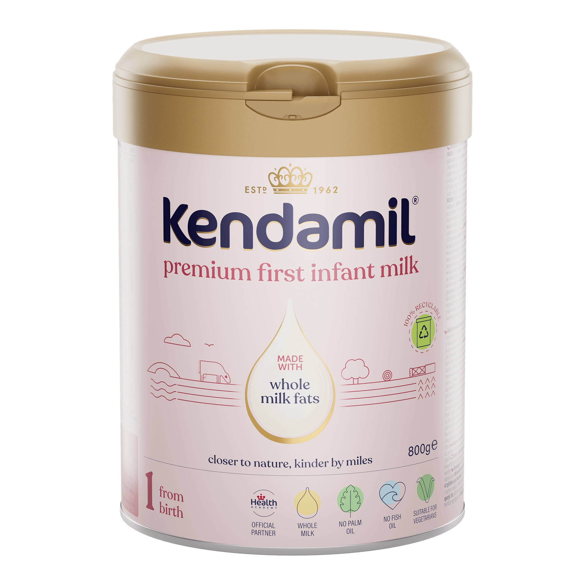 Více než 60 let výzkumu a vývoje v každé kapce. Kojenecká mléčná výživa Kendamil Premium, inspirovaná přírodou a složením mateřského mléka, je vyrobena z kvalitního plnotučného kravského mléka s přirozeným obsahem mléčného tuku. Určeno pro kojence od narození do ukončeného 6. měsíce, pokud nemohou být kojeni. Certifikováno pro vegetariány.