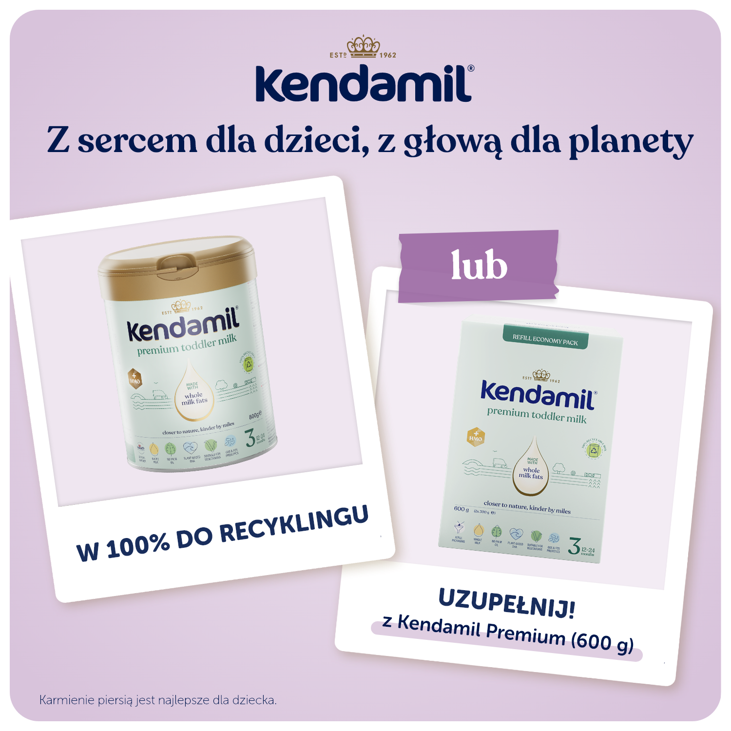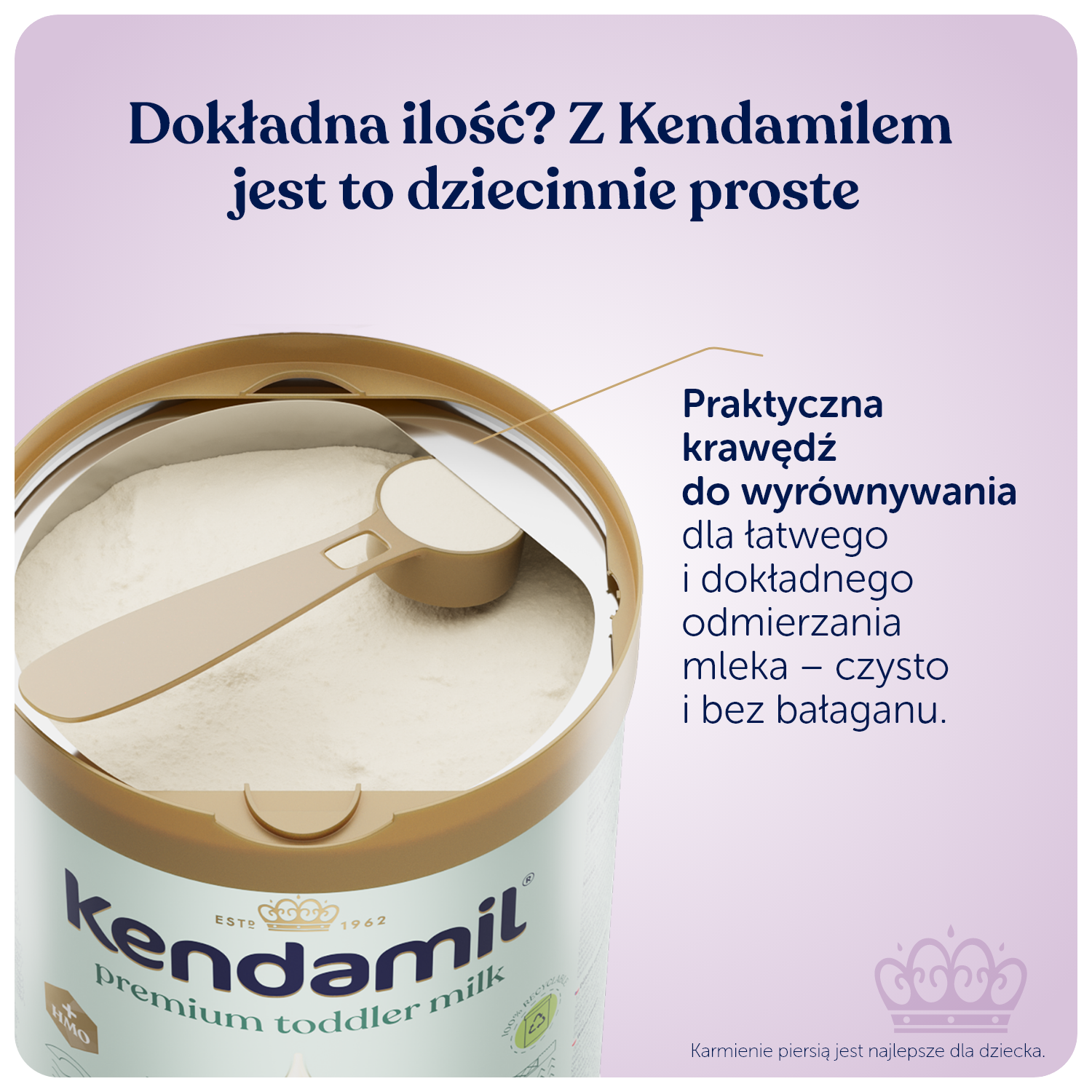 Ważna uwaga: Karmienie piersią to najlepszy sposób żywienia Twojego dziecka. KENDAMIL PREMIUM 3 HMO+ jest przeznaczone do żywienia małych dzieci od ukończonego 12 miesiąca życia i powinno stanowić jedynie część zróżnicowanej i zbilansowanej diety małego dziecka. Podczas karmienia z butelki należy unikać niepotrzebnego przedłużania kontaktu smoczka z ząbkami, gdyż zwiększa to ryzyko wystąpienia próchnicy. Dbaj o higienę jamy ustnej dziecka, zwłaszcza przed snem. Przestrzegaj sposobu użytkowania dotyczącego przygotowania, karmienia i przechowywania, w przeciwnym razie zagrozisz zdrowiu dziecka. Nie jest przeznaczony dla dzieci do 12 miesiąca życia.