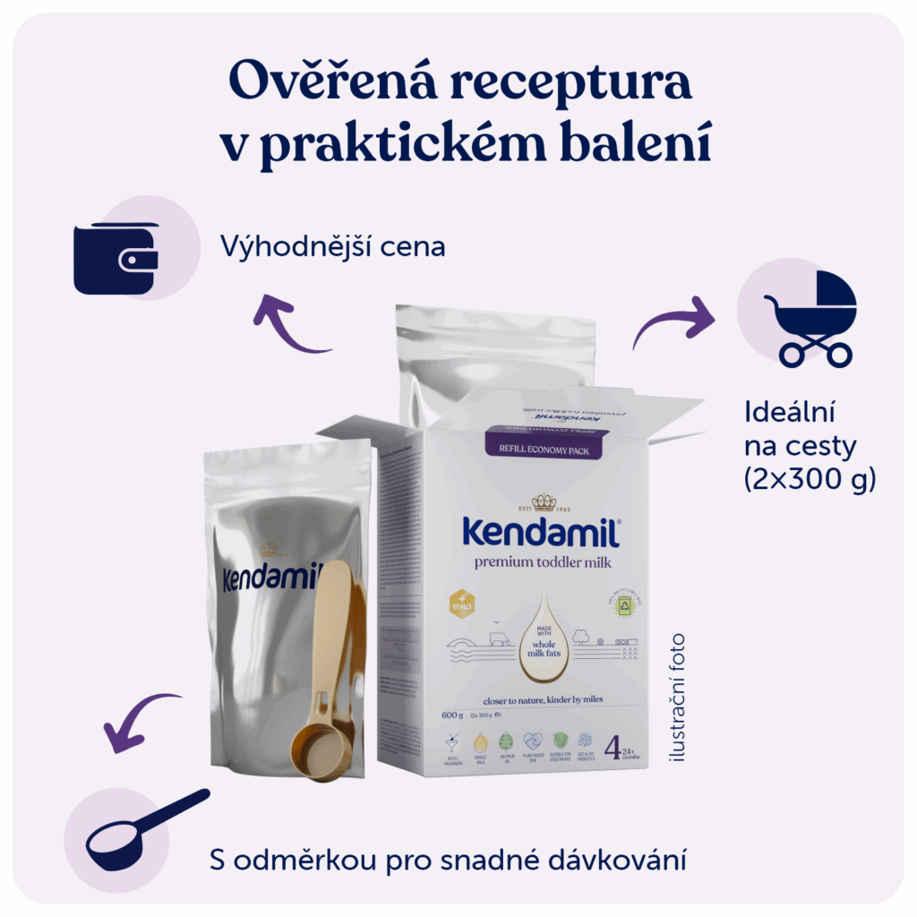 Důležité upozornění: Kojení je nejlepší způsob výživy Vašeho dítěte. KENDAMIL PREMIUM 4 HMO+ je určen pro výživu malých dětí od ukončeného 24. měsíce a měl by tvořit pouze součást smíšené a vyvážené stravy malého dítěte. Při krmení z lahvičky, zamezte nepotřebnému prodlužování kontaktu savičky se zoubky, zvyšujete tím riziko zubního kazu. Pečujte o hygienu ústní dutiny dítěte, především před spaním. Dodržujte pokyny pro přípravu, krmení a skladování, jinak ohrozíte zdraví dítěte. Není určeno pro děti do 12 měsíců.