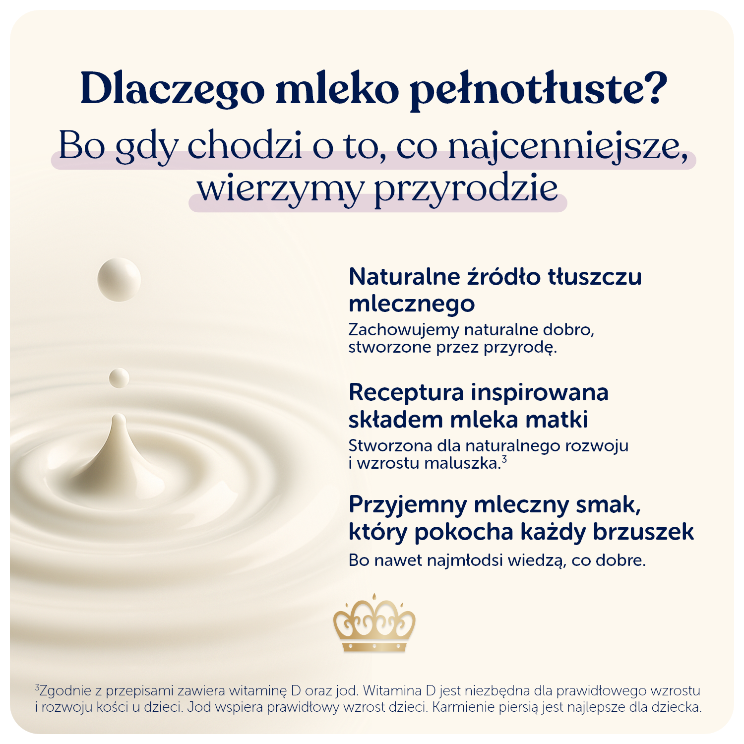 Pełnotłuste MLEKO (173 g płynnego MLEKA na 100 g proszku), odtłuszczone MLEKO, laktoza (z MLEKA), oleje roślinne (słonecznikowy, kokosowy, rzepakowy), galaktooligosacharydy (z MLEKA) 2,2%, sole wapniowe kwasu ortofosforowego, mleczan wapnia, wodorotlenek potasu, olej z mikroalg Schizochytrium sp., olej z Mortierella alpina, L-askorbinian sodu, fruktooligosacharydy 0,16%, sole wapniowe kwasu cytrynowego, nukleotydy (5′-monofosforan cytydyny, sól disodowa urydyny-5-’monofosforanu, 5′-monofosforan adenozyny, sól disodowa 5′-monofosforanu inozyny, sól disodowa 5′-monofosforanu guanozyny), pirofosforan żelaza (III), witamina E, siarczan cynku, niacyna, D-pantotenian wapnia, siarczan miedzi (II), witamina A, tiamina, rybofl awina, witamina B6, kwas foliowy, siarczan manganu, jodek potasu, witamina K, selenian (IV) sodu, biotyna, witamina D3, witamina B12, regulator kwasowości (kwas cytrynowy).