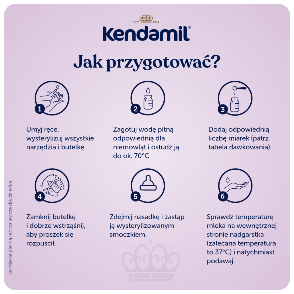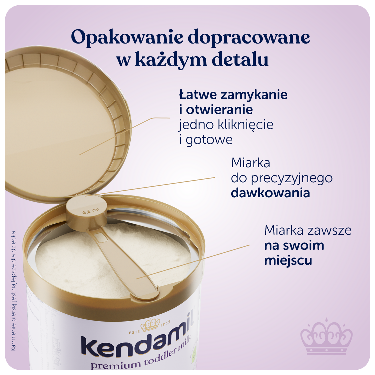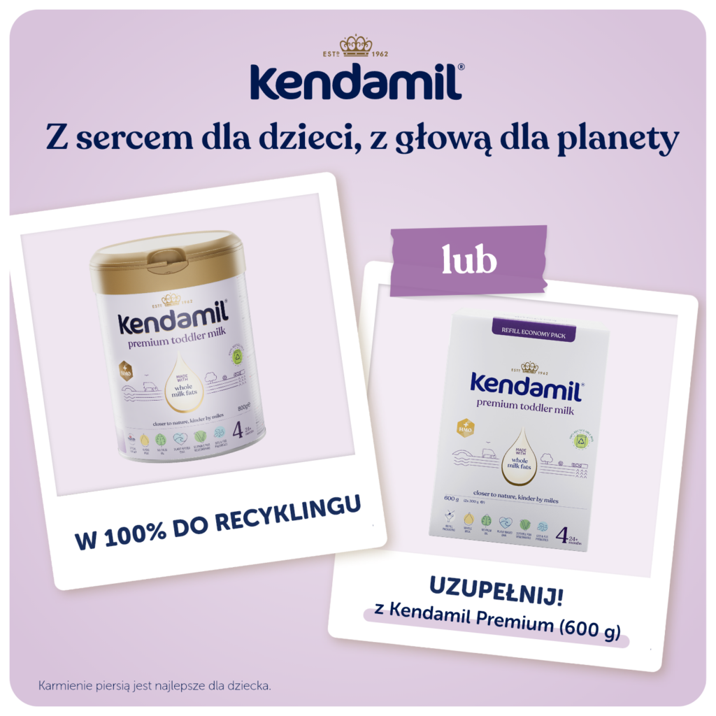 Ważna uwaga: Karmienie piersią to najlepszy sposób żywienia Twojego dziecka. KENDAMIL PREMIUM 4 HMO+ jest przeznaczone do żywienia małych dzieci od ukończonego 24 miesąca życia i powinno stanowić jedynie część zróżnicowanej i zbilansowanej diety małego dziecka. Podczas karmienia z butelki należy unikać niepotrzebnego przedłużania kontaktu smoczka z ząbkami, gdyż zwiększa to ryzyko wystąpienia próchnicy. Dbaj o higienę jamy ustnej dziecka, zwłaszcza przed snem. Przestrzegaj sposobu użytkowania dotyczącego przygotowania, karmienia i przechowawania, w przeciwnym razie zagrozisz zdrowiu dziecka. Nie jest przeznaczony dla dzieci do 12 miesiąca życia.